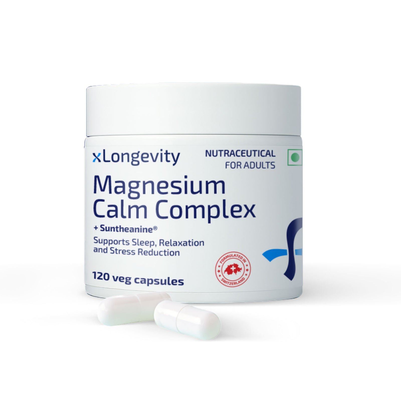 Experience relaxation and improved focus with our Magnesium Calm Complex, a natural way to help manage stress and support your brain health. This unique formula features two highly absorbable forms of elemental magnesium - Magnesium Bisglycinate and Magnesium Threonate - providing a gentle yet powerful 300 mg dose per serving. It promotes muscle relaxation and supports cognitive function, both important for your overall health. Infused with Suntheanine®, a patented form of L-theanine, this blend calms the mind without causing drowsiness, allowing you to stay clear-headed and focused throughout your day. By effectively managing stress, our advanced formula helps combat the accelerated aging linked to chronic stress and mental fatigue, offering transformative benefits for your cognitive clarity and emotional well-being.